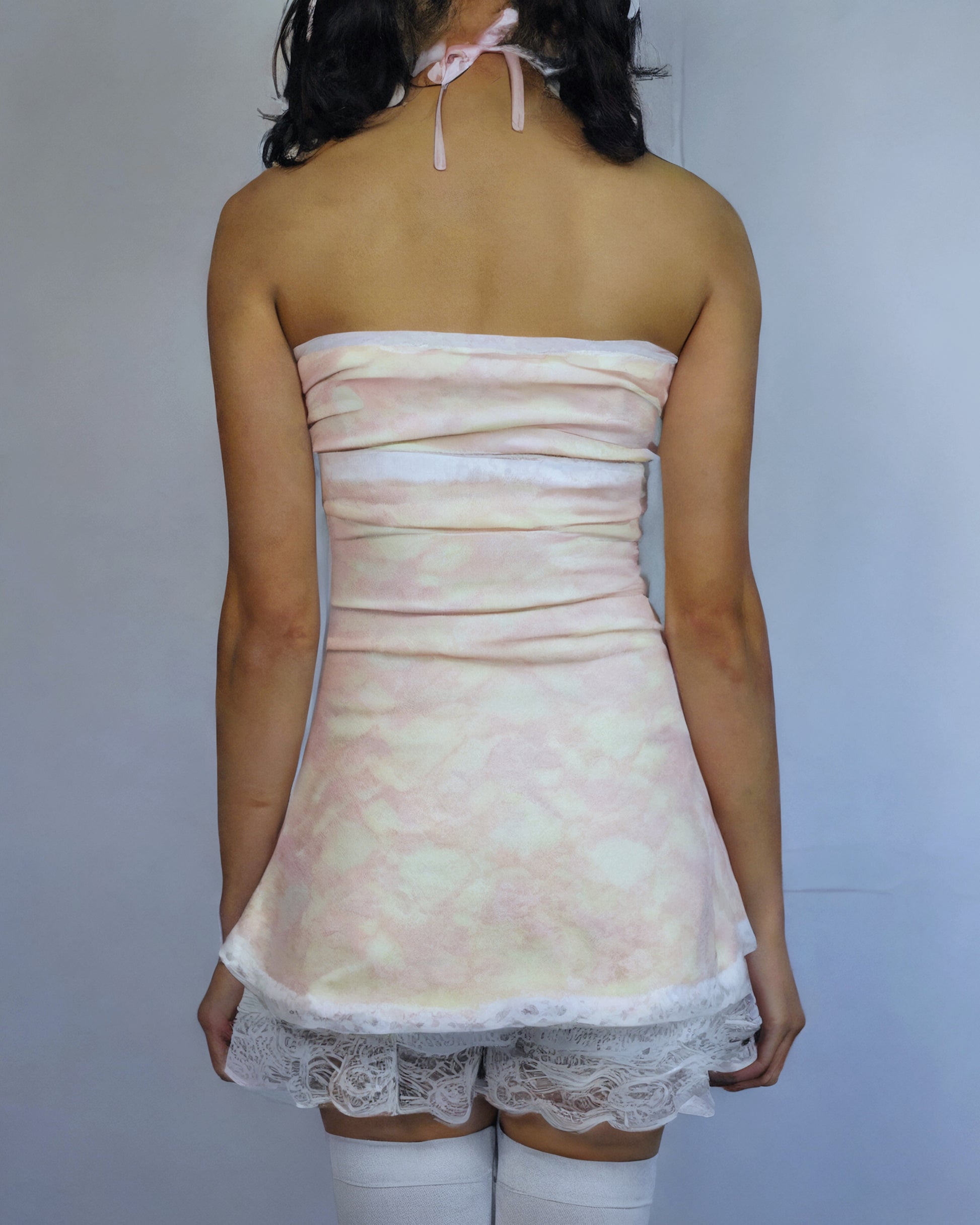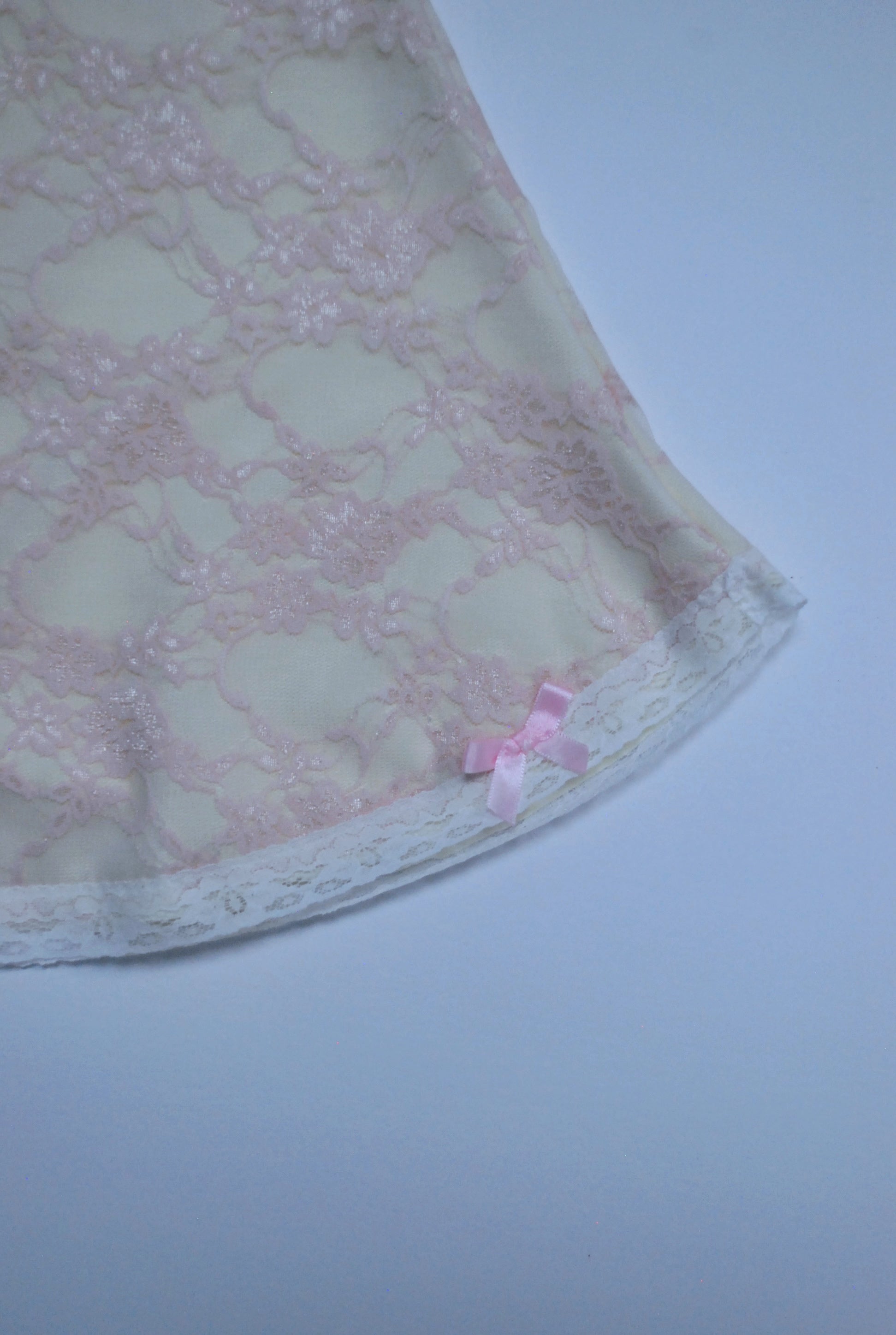 ♡ Dreamy strapless mini dress in the softest pastel pink floral lace over a pastel yellow lining with delicate lace trim