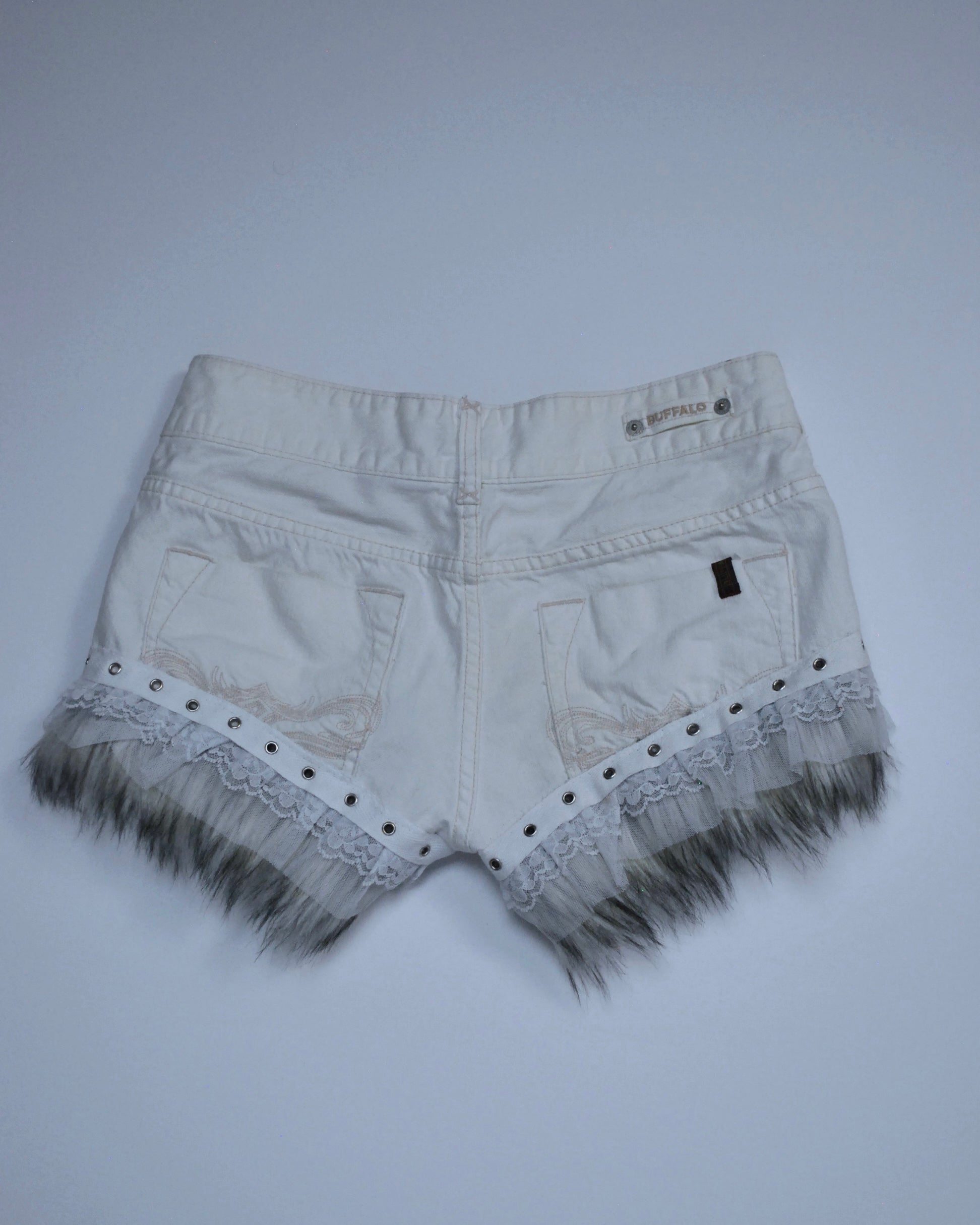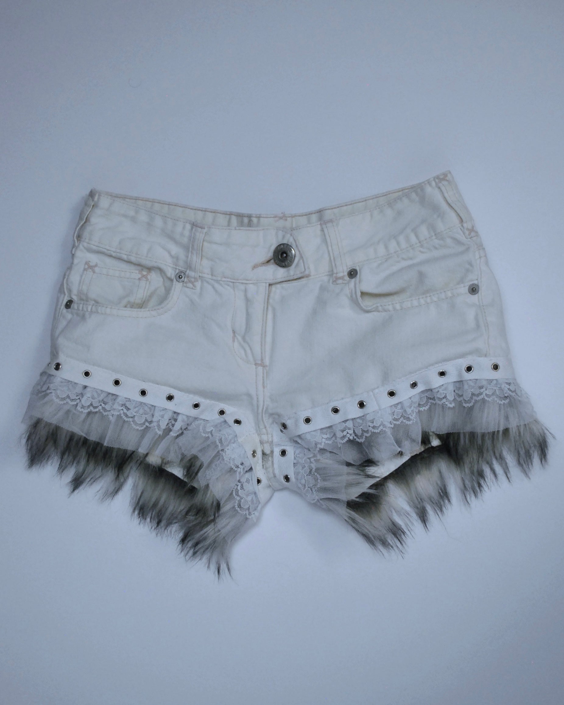 ♡ One-of-one white denim shorts with silver fur trim, grommets, and delicate lace accents